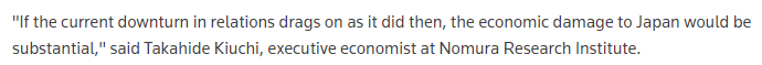 文章同样援引日本野村综合研究所执行经济学家木内隆秀的分析报告,认为中日间的紧张关系将导致来自中国大陆和香港的赴日旅游人数大幅下降,这将重创日本的旅游业。报告还进一步分析认为,中日间的紧张关系还将影响到日本的进出口贸易,甚至可能会对日本企业在华业务产生负面影响,这些将对日本经济产生“更严重”的影响。
