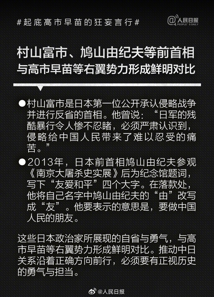 1993年高市早苗当选日本国会议员后,公开主张修改日本和平宪法、扩大和改名日本自卫队、参拜靖国神社,其言行与许多臭名昭著的日本右翼政客如出一辙。高市2014年来参拜靖国神社超10次。历史的教训岂敢忘却!我们绝不允许日本军国主义复活,破坏世界和平稳定。