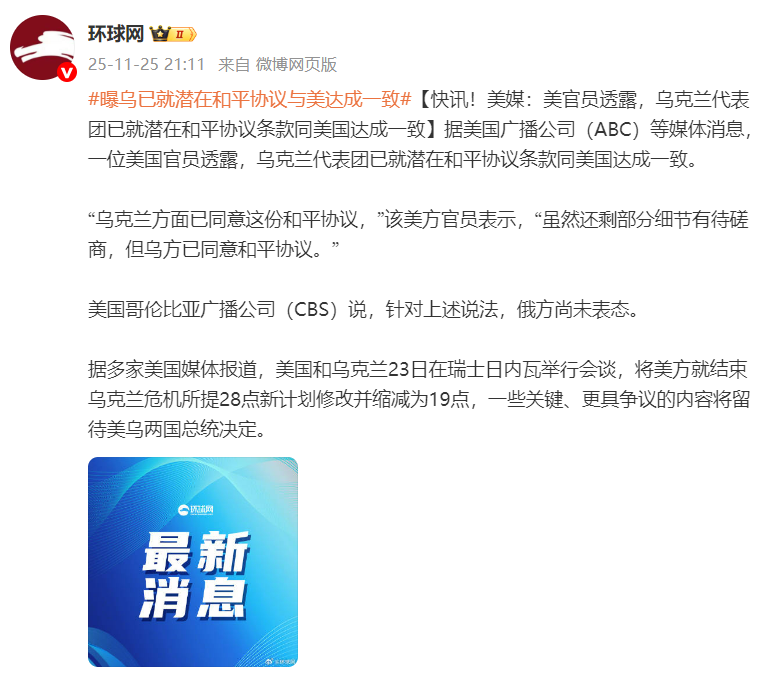 据环球网援引美国广播公司(ABC)等媒体消息,一位美国官员透露,乌克兰代表团已就潜在和平协议条款同美国达成一致。