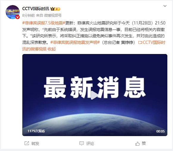 菲律宾火山地震研究所于今天(11月28日)21:50发声明称,“先前由于系统错误,发生误报地震信息一事,目前已经将相关内容撤下。”该研究所表示,将采取纠正措施以避免类似事件再次发生,并对由此造成的混乱深表歉意。