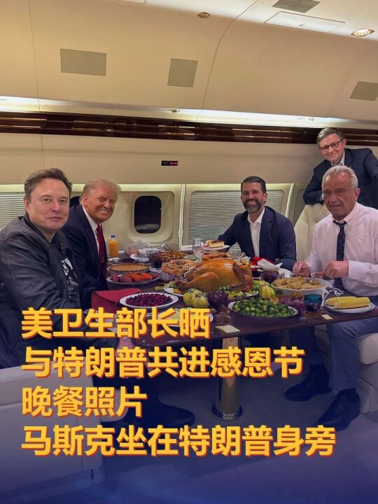 近日,美国卫生部长小罗伯特·肯尼迪在社交媒体上发布了与特朗普共进感恩节晚餐的照片,照片中美企业家埃隆·马斯克坐在特朗普身旁。