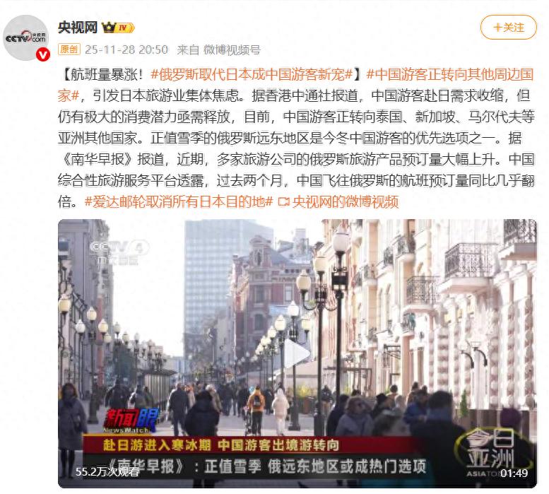 据央视网11月28日报道,中国游客正转向其他周边国家,引发日本旅游业集体焦虑。据香港中通社报道,中国游客赴日需求收缩,但仍有极大的消费潜力亟需释放,目前,中国游客正转向泰国、新加坡、马尔代夫等亚洲其他国家。