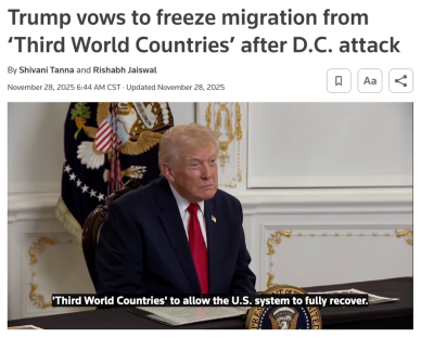 △路透社报道,美国总统特朗普宣布将“永久暂停”来自所有“第三世界国家”的移民。