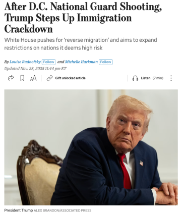 △《华尔街日报》报道,国民警卫队员遭枪击事件后,美国总统特朗普加大力度倡导“反向移民”议程,旨在扩大对来自贫困国家的移民的打击。