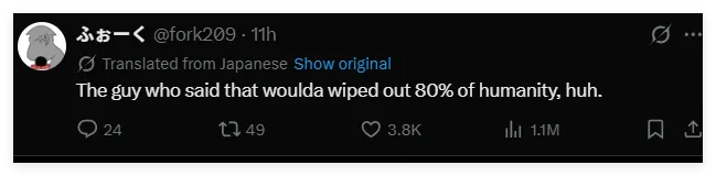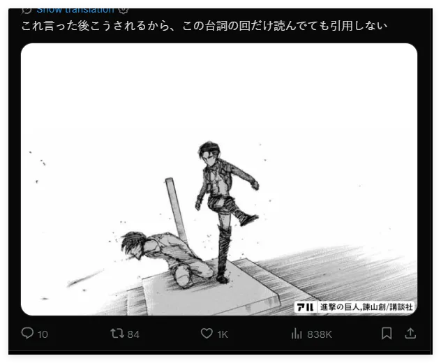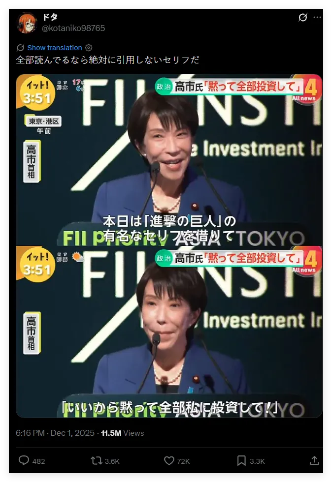“要是你真的从头到尾读了《进击的巨人》,就会知道这句话是绝对不该被引用的”,一位震惊的日本网民这样写道。截至12月2日傍晚,这条吐槽高市早苗的帖文,已经获得超过1100万次的阅读量,以及3600次转发。