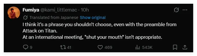 尽管当时高市早苗是“嬉皮笑脸”地说出这句话,但众多日本网民却纷纷指出,这句相当粗野的话不仅根本就不适合这样一个正式场合,而且,在漫画的后续剧情中,说出这句话的艾伦·耶格尔还辜负了所有人的信任,黑化成了一个大反派,甚至还一度屠杀掉故事中的世界里80%的人口……