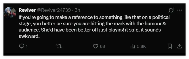 “要是在政治场合拿这种东西做引子,就得确保幽默效果和受众共鸣都精准到位。她还不如稳妥行事呢,现在听着太尬了”。