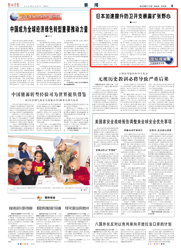 12月7日,《解放军报》第04版发表文章《日本加速提升防卫开支暴露扩张野心》。