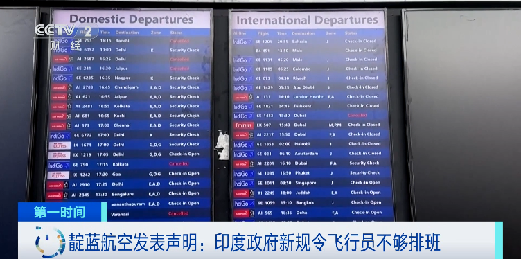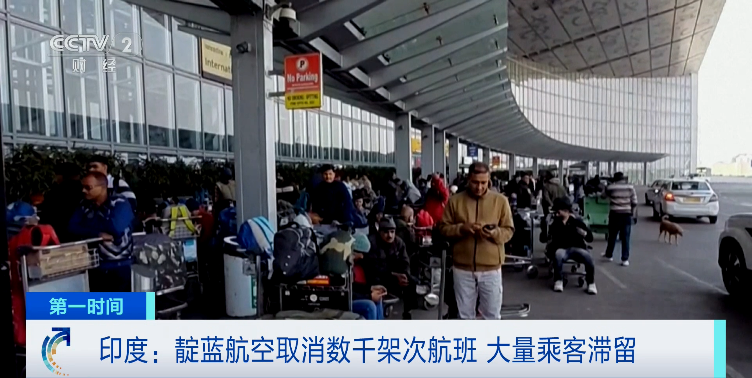 由于印度政府颁布新规导致飞行员排班困难等问题,印度靛蓝航空公司连续5天取消航班数千架次,导致大量乘客滞留。