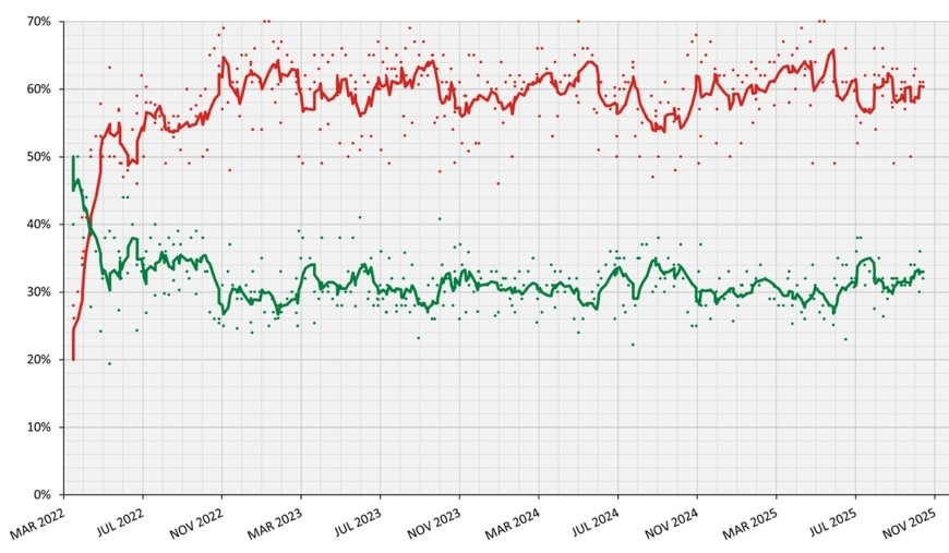 2022年3月-2025年10月博里奇政府支持率(红色)与不支持率(绿色) 数据来源:https://en.wikipedia.org/wiki/Gabriel_Boric