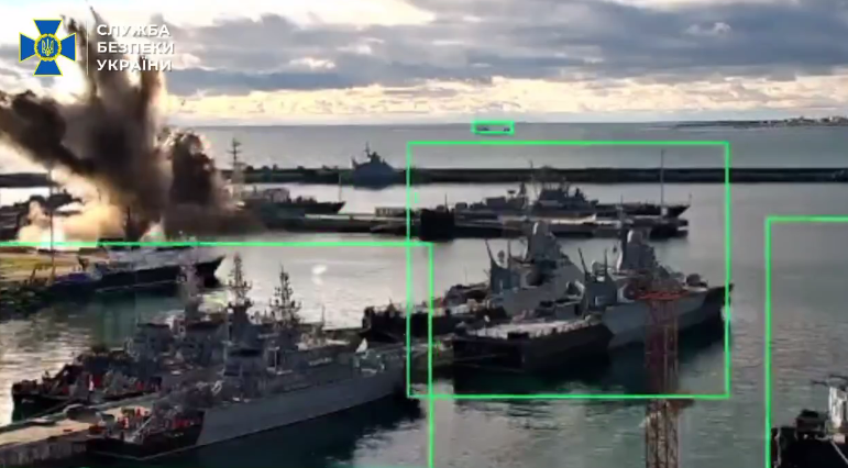 △乌国家安全局公布的击伤俄“华沙女人”级潜艇视频截图