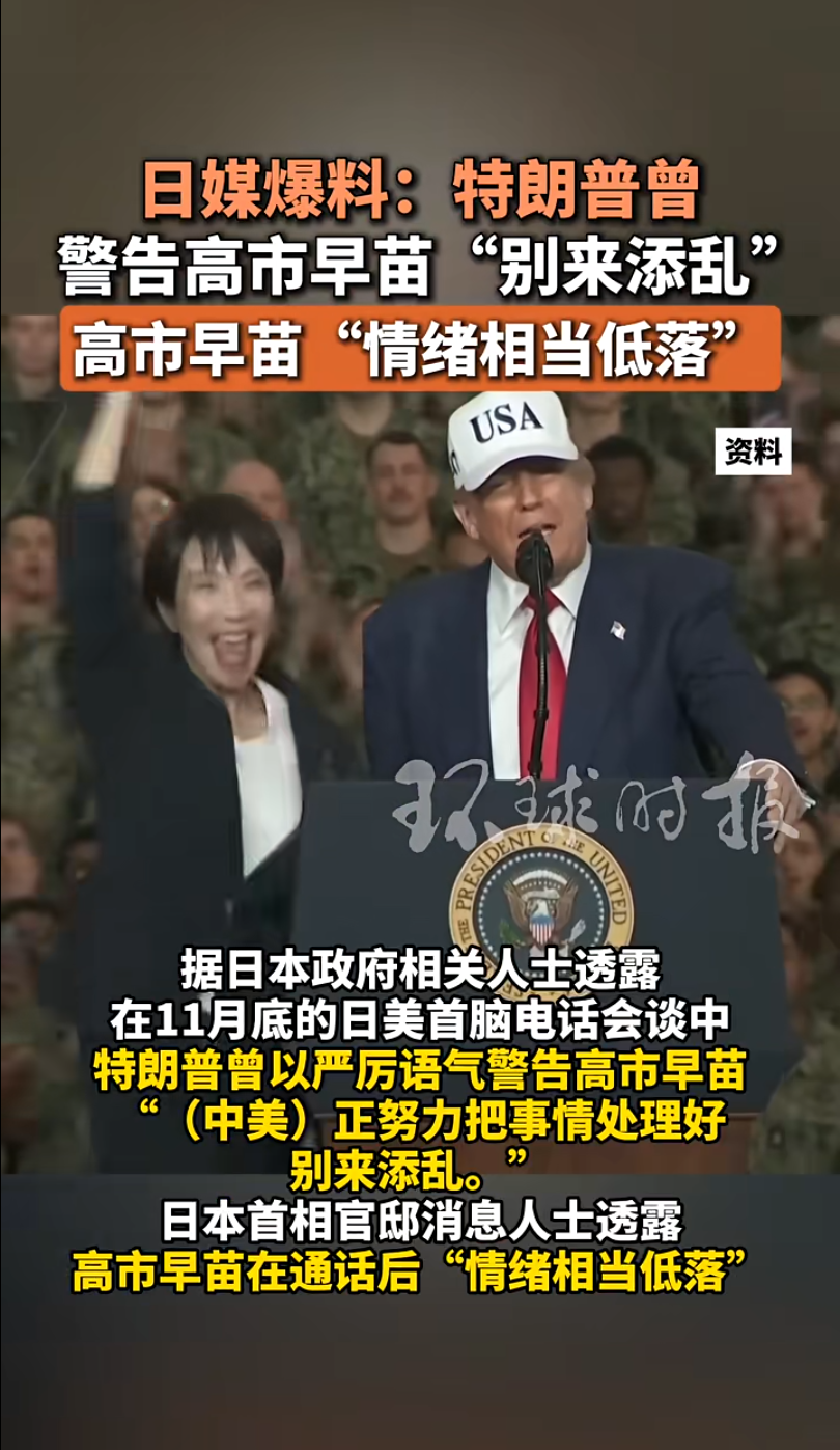 据环球时报援引日本《北海道新闻》12月14日的报道称,消息人士透露,在谈及中美以及中日关系时,美国总统特朗普曾对日本首相高市早苗警告称“别来添乱”。