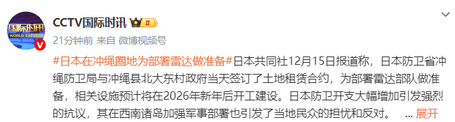 日本共同社12月15日报道称,日本防卫省冲绳防卫局与冲绳县北大东村政府当天签订了土地租赁合约,为部署雷达部队做准备,相关设施预计将在2026年新年后开工建设。日本防卫开支大幅增加引发强烈的抗议,其在西南诸岛加强军事部署也引发了当地民众的担忧和反对。