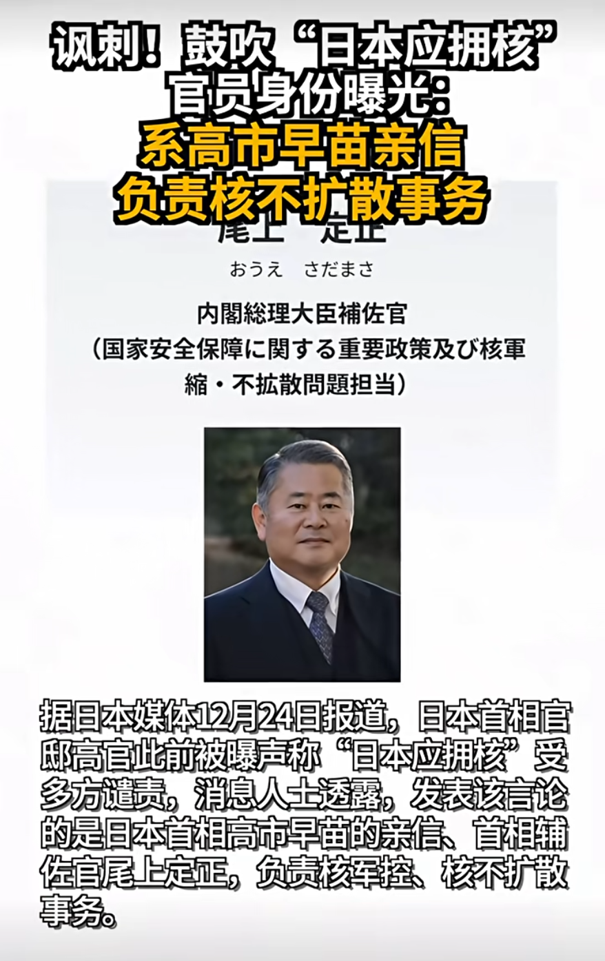 据参考消息援引日媒24日报道,近日,日本首相官邸高官被曝声称“日本应拥核”,受到多方谴责。消息人士透露,发表该言论的是日本首相高市早苗的亲信、首相辅佐官尾上定正,负责核军控、核不扩散事务。