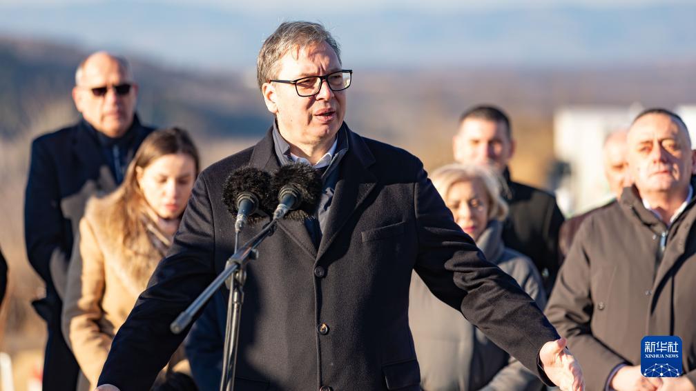 12月29日,在塞尔维亚戈卢巴茨市,塞尔维亚总统武契奇视察“多瑙走廊”快速路项目时发表讲话。新华社发(王韡摄)
