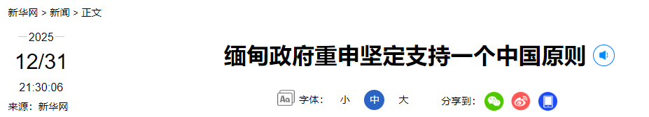 针对近日美国宣布向中国台湾地区大规模出售武器一事,缅甸国防与安全委员会新闻发布组组长佐敏吞2025年12月31日在接受新华社记者采访时表示,美国应恪守中美建交公报,该公报明确承认中华人民共和国政府是中国的唯一合法政府,台湾是中国的一部分。