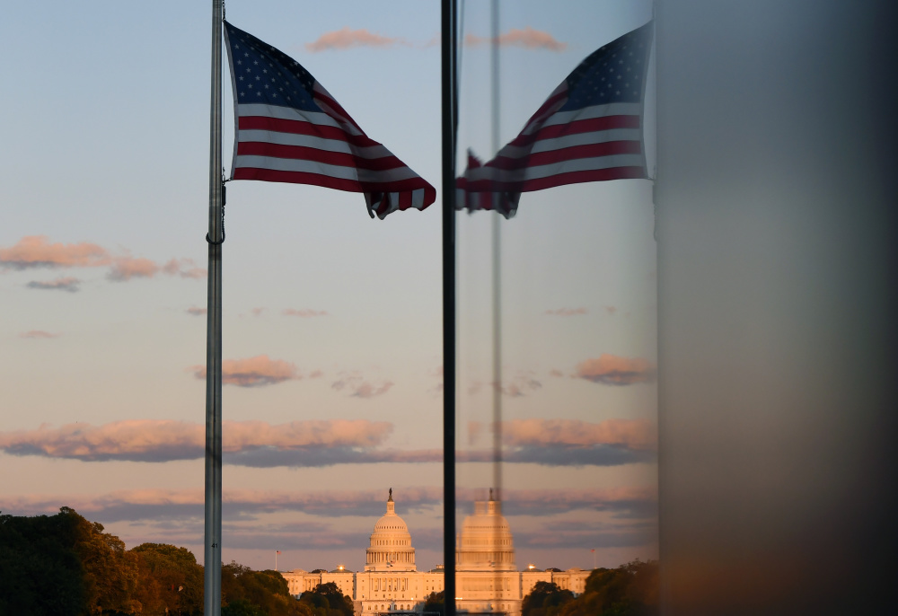 这是2025年10月8日在美国华盛顿拍摄的日落时分的国会大厦。新华社记者李睿摄