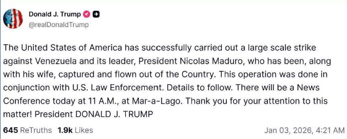 当地时间1月3日上午11点,特朗普将在海湖庄园举行新闻发布会介绍行动细节。