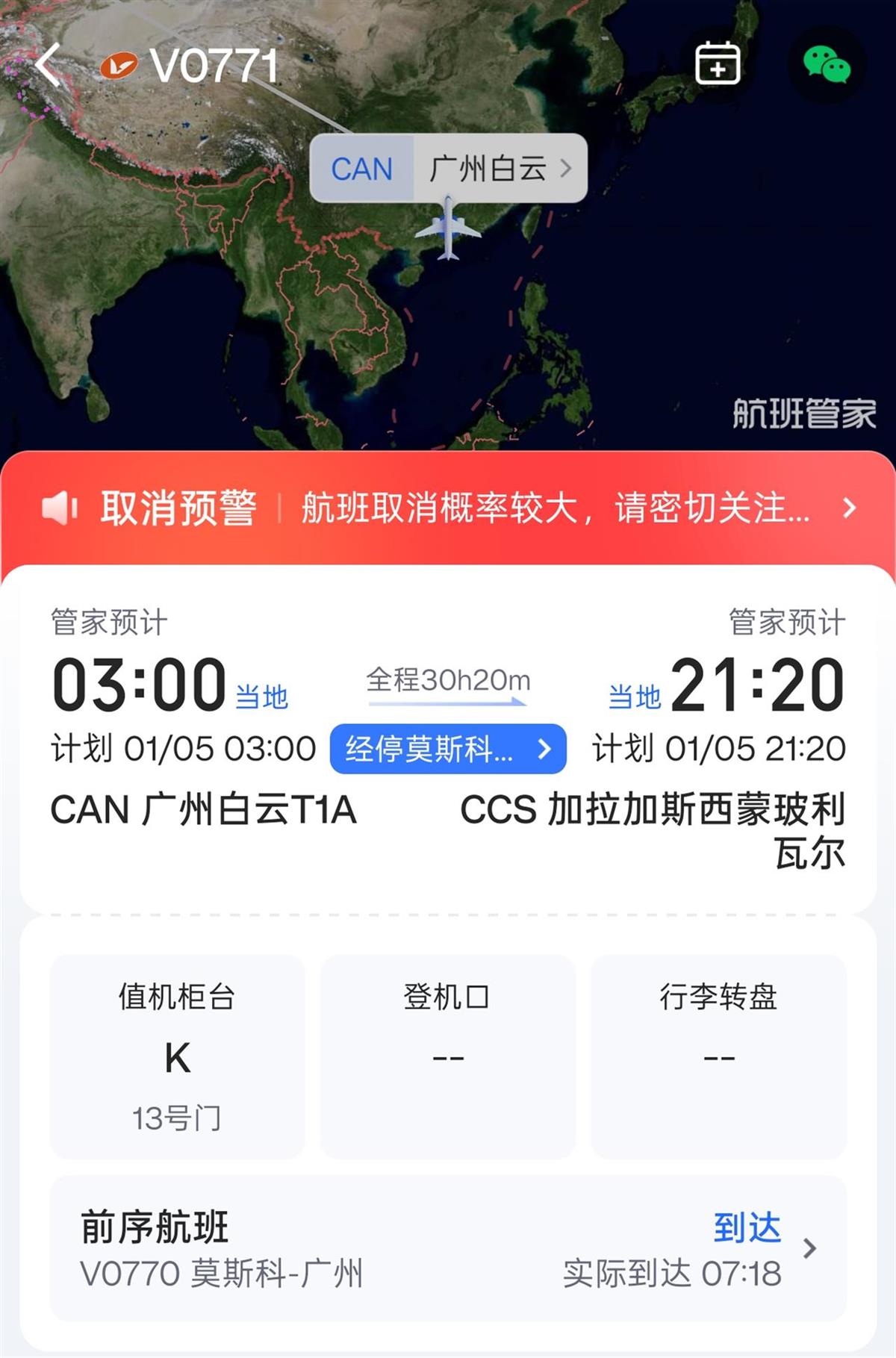航班管家APP显示,广州往返加拉加斯的航线需经停莫斯科,全程约30个小时。1月5日起飞的V0771次航班为最新的一班,下次起飞将是1月19日。