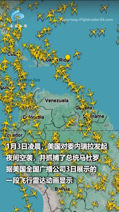 1月3日凌晨,美国对委内瑞拉发起夜间空袭,并抓捕了总统马杜罗。据美国全国广播公司3日展示的一段飞行雷达动画显示,美军行动期间,所有航班飞机几乎全部绕开了委内瑞拉领空。