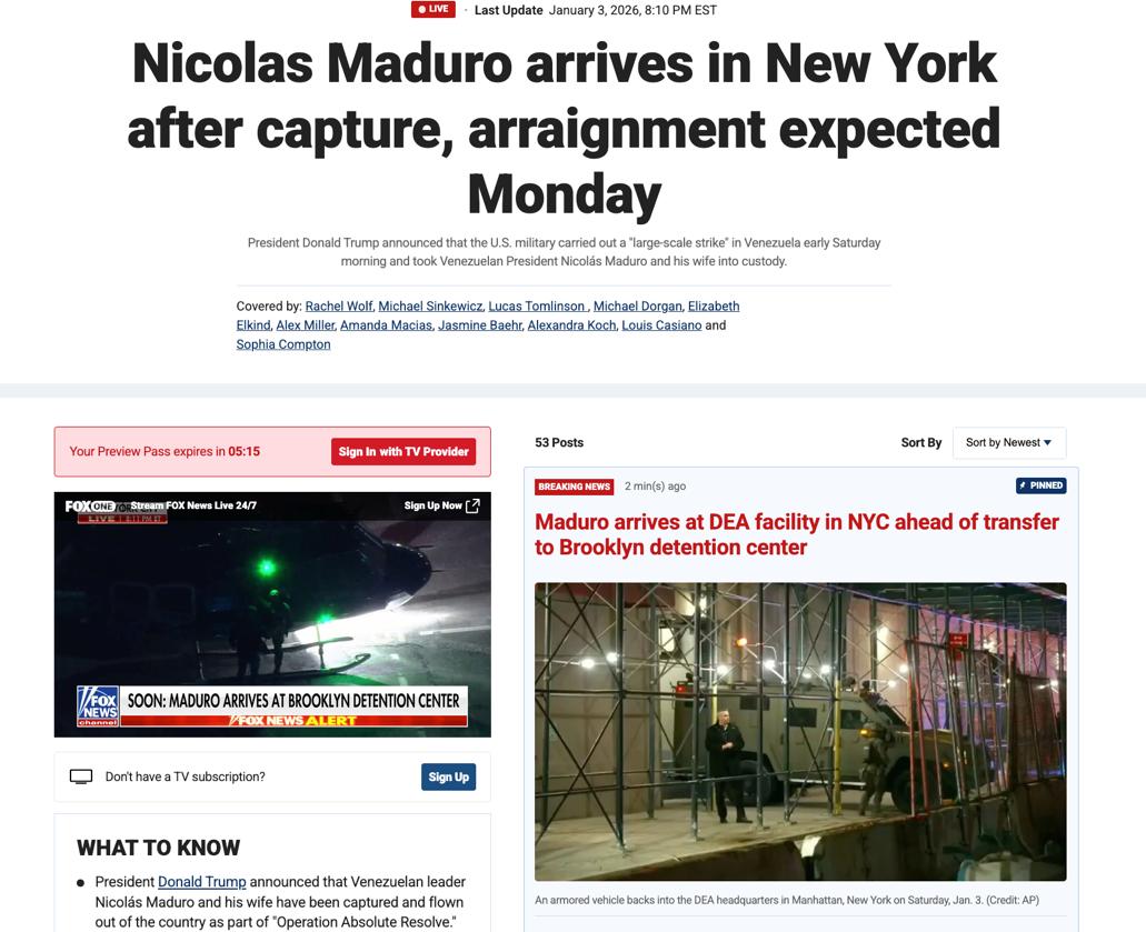 △福克斯报道,马杜罗已被押至纽约,预计周一接受传讯。