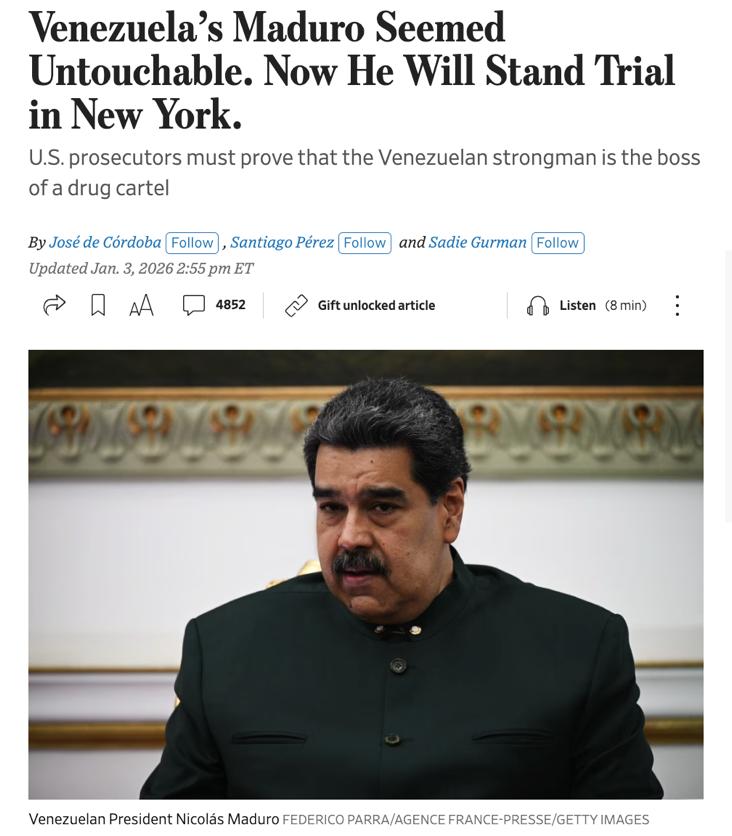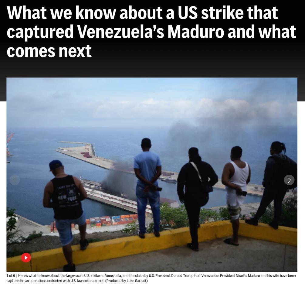 △美联社报道,美国发动闪电军事打击抓获马杜罗及妻子,并将他们押送美国接受审判。