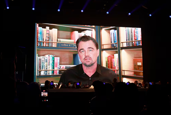 棕榈泉国际电影节发言人称:“由于意外的旅行中断与空域限制,莱昂纳多·迪卡普里奥今晚无法亲自出席。”颁奖典礼上,迪卡普里奥通过录制的视频发表获奖感言。