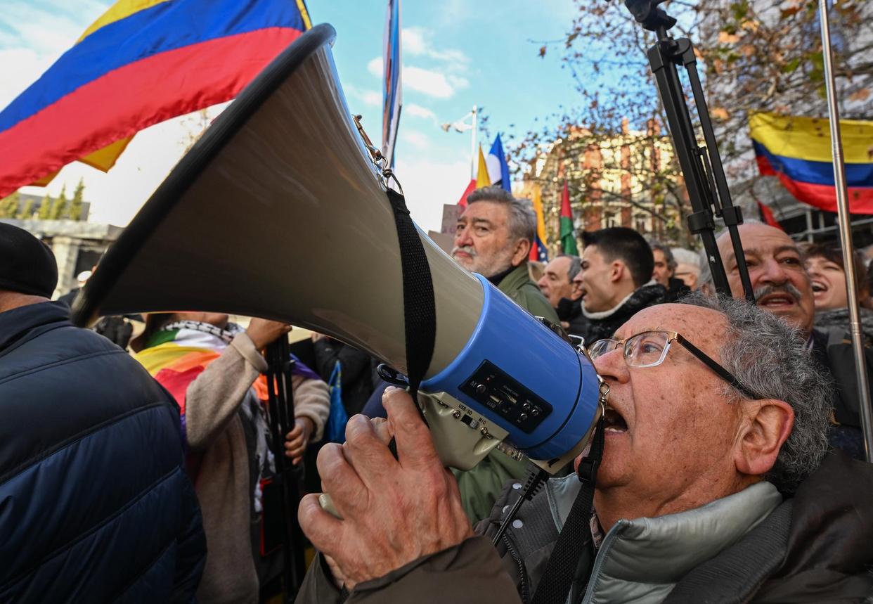 1月4日,民众在西班牙马德里市中心的美国驻西班牙大使馆前,抗议美国对委内瑞拉采取军事行动。新华社记者程敏摄