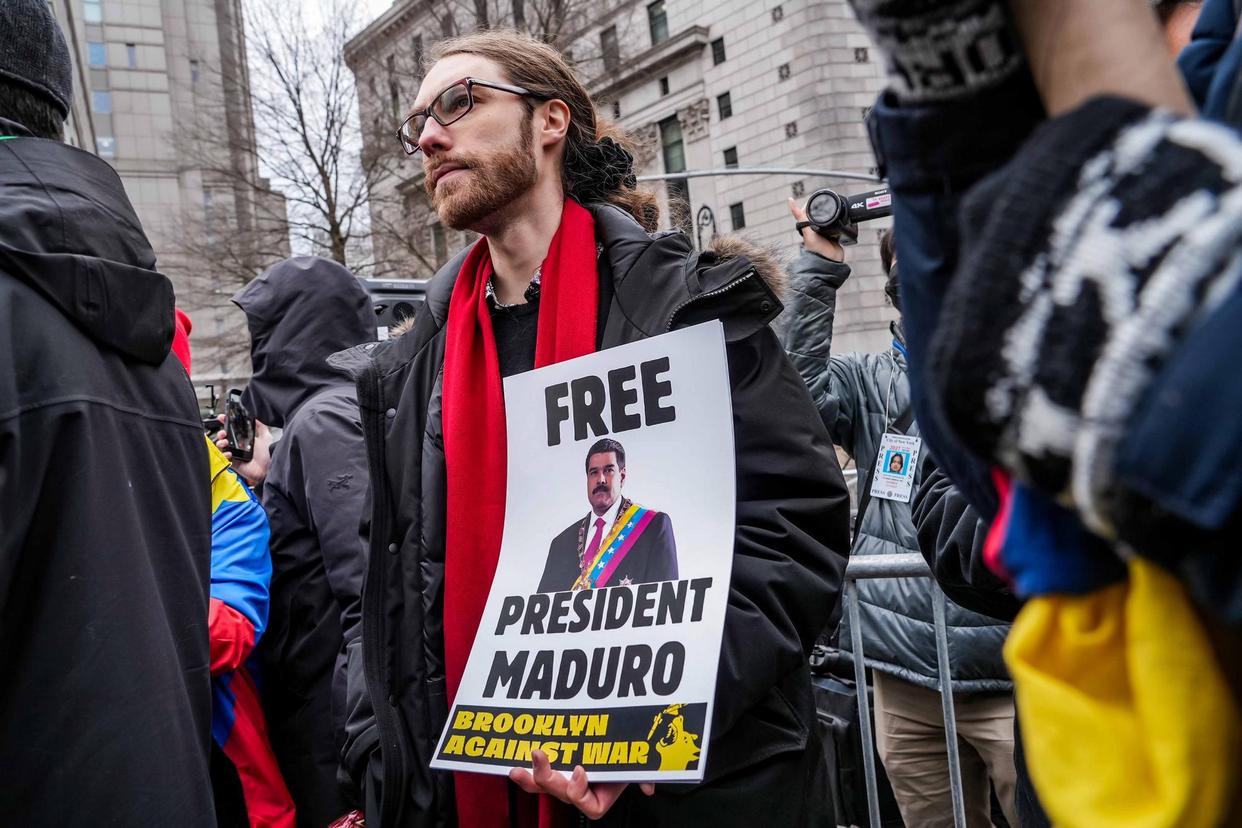 1月5日,抗议者聚集在美国纽约南区联邦地区法院外要求释放马杜罗。新华社发(章正浩摄)