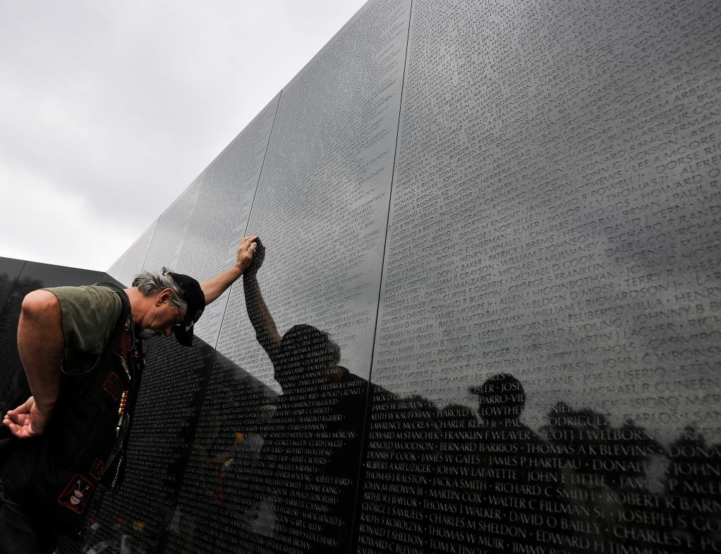 2010年5月29日,在美国首都华盛顿市中心的越战纪念碑前,一名老兵怀念去世的战友。新华社记者张军摄