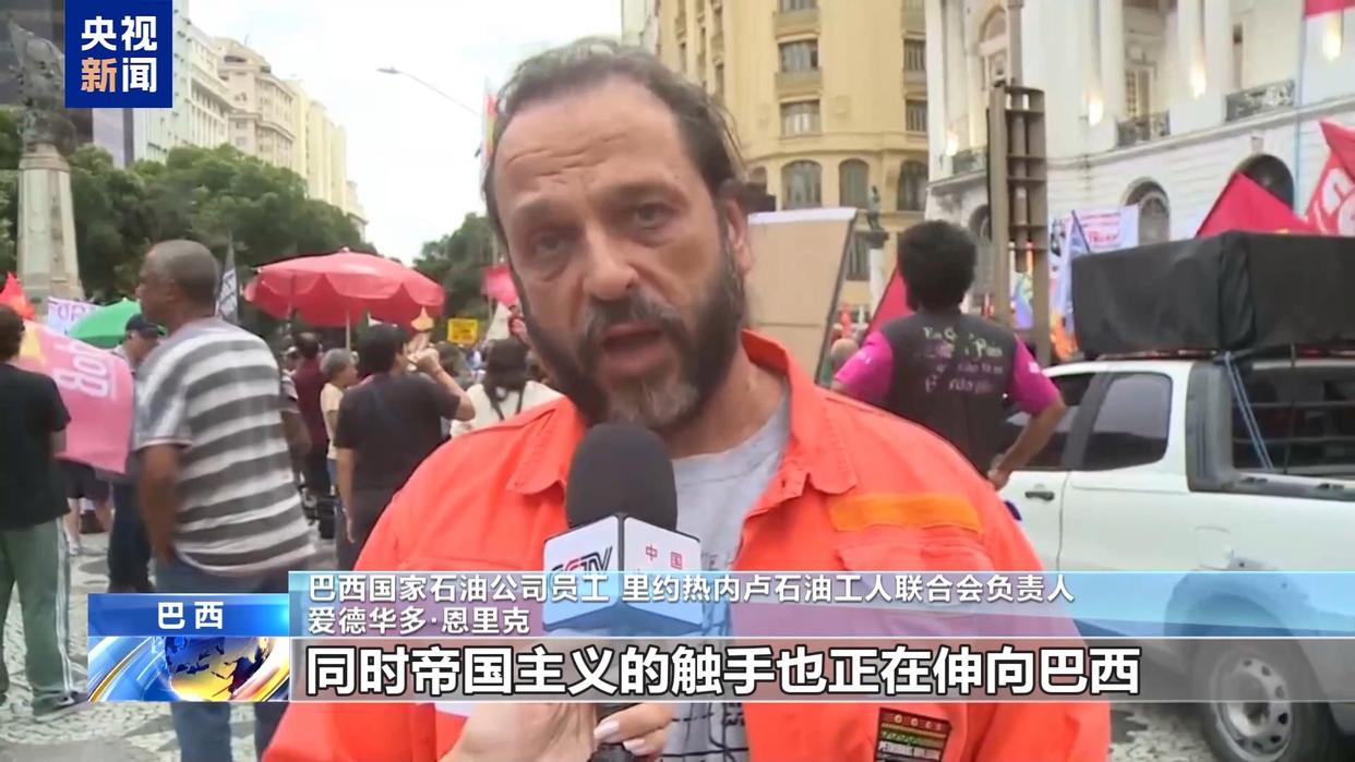 巴西国家石油公司员工 里约热内卢石油工人联合会负责人 爱德华多·恩里克:在我们看来,这场争夺显然围绕着石油展开,同时帝国主义的触手也正在伸向巴西。正因如此,我们站在一起,目标是把帝国主义势力赶出拉丁美洲,无论是来自美国,还是来自任何其他国家,我们不是任何国家的“后院”。