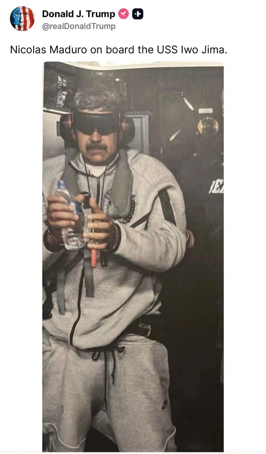 3日,特朗普在社交媒体上发布一张委内瑞拉总统马杜罗在美国军舰上戴手铐、双眼被蒙住的照片。英国《星期日邮报》头版刊登这张照片,并配以醒目标题——“美国走上战争之路”。