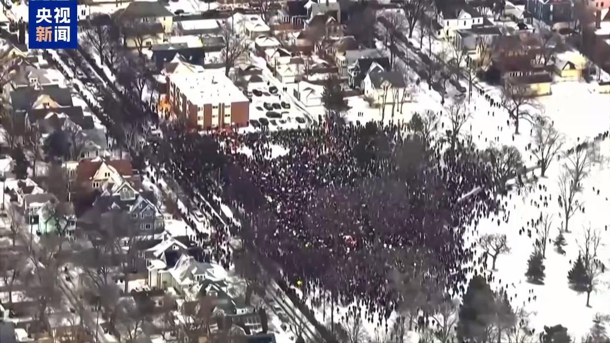 央视记者 徐德智:纽约现在的天气情况其实并不太好,因为一方面气温很低,而另外一方面现在也已经开始下雨了。但是仍然有上百人出现在了我身后的美国联邦政府大楼前面,对明尼阿波利斯市所发生的枪击事件进行抗议,来表达他们的不满。