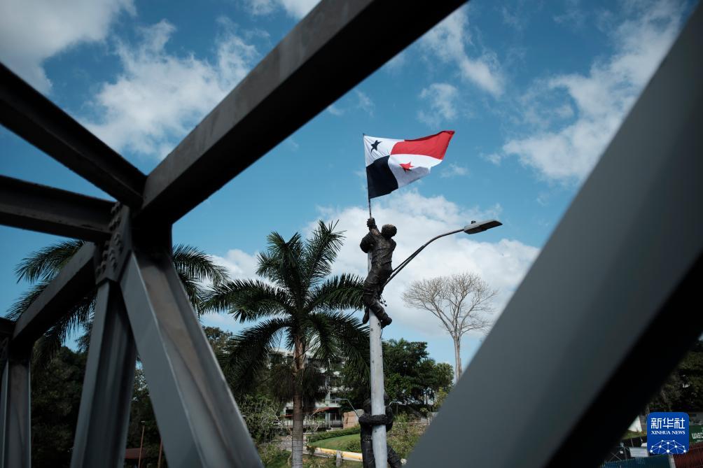 1月9日,在巴拿马首都巴拿马城的一座纪念“护旗运动”的雕塑上,巴拿马国旗迎风飘扬。新华社记者 许咏政 摄