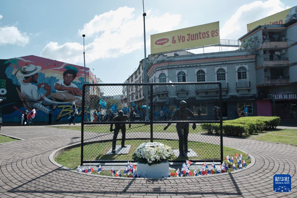 1月9日,在巴拿马首都巴拿马城,游行队伍经过一座纪念“护旗运动”的雕塑。新华社记者 许咏政 摄