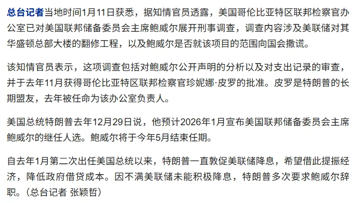 据@CCTV国际时讯,据《纽约时报》当地时间1月11日报道,美国哥伦比亚特区联邦检察官办公室已就美国联邦储备委员会华盛顿总部翻修相关事宜,对美联储主席鲍威尔启动刑事调查。知情官员表示,这项调查包括对鲍威尔公开声明的分析以及对支出记录的审查,并于去年11月获得哥伦比亚特区联邦检察官珍妮娜·皮罗的批准。皮罗是特朗普的长期盟友,去年被任命为该办公室负责人。