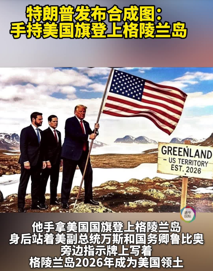 美国总统特朗普20日凌晨在社交媒体上发布图片,他手拿美国国旗登上格陵兰岛,身后站着美国副总统万斯和国务卿鲁比奥,旁边指示牌上写着“格陵兰岛2026年成为美国领土”。
