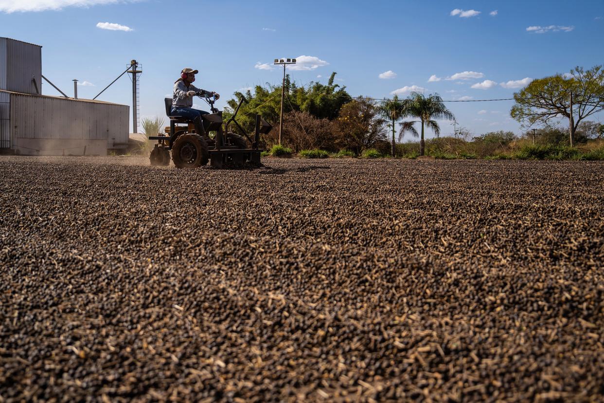 2025年8月27日,在位于巴西米纳斯吉拉斯州巴拉那伊巴河畔卡尔穆的一家咖啡庄园,工作人员驾驶机械翻动晾晒中的咖啡豆。新华社记者王天聪摄 巴西咖啡出口企业委员会说,上述变化主要因为特朗普政府一度对巴西咖啡大幅征收关税。2025年8月初至11月末,美国对巴西所有咖啡品类征收高关税,在此期间,巴西出口到美国的咖啡同比锐减55%。