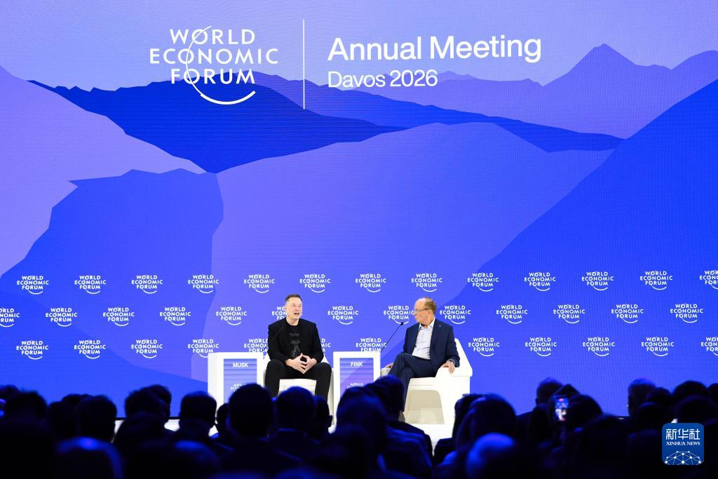 1月22日,美国企业家埃隆·马斯克(左)在瑞士达沃斯举办的世界经济论坛2026年年会上发言。新华社记者 连漪 摄