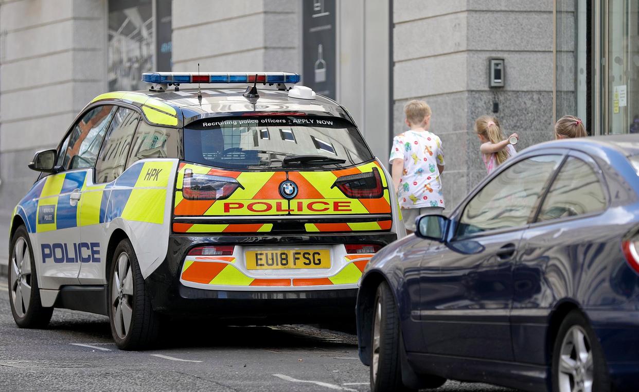 2022年8月8日,几名儿童从英国伦敦街头的警车旁走过。新华社记者李颖摄