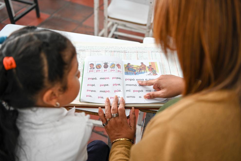 1月12日,在委内瑞拉首都加拉加斯的费尔明·托罗中小学,老师教学生读课文。