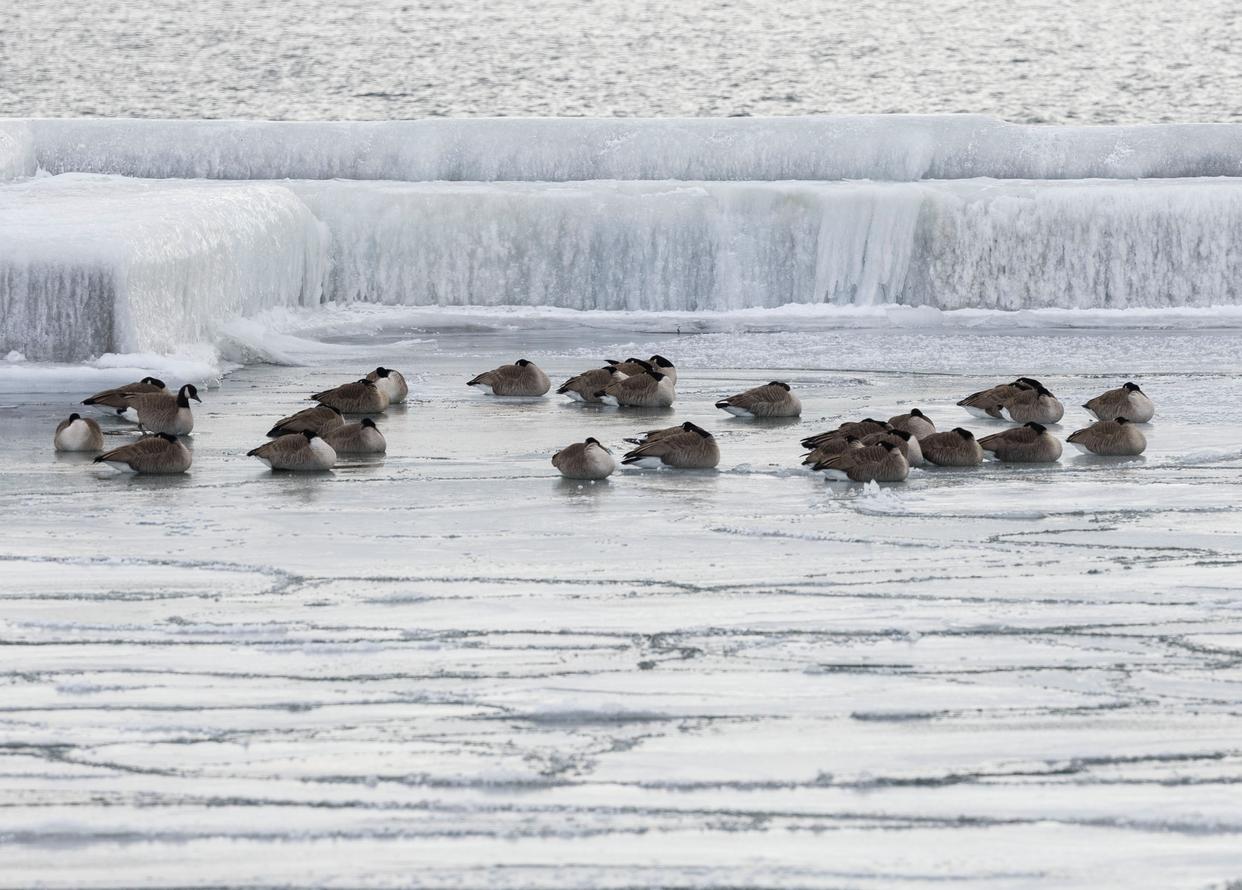 1月24日,在加拿大多伦多,一群加拿大鹅在结冰的安大略湖上休憩。新华社发(邹峥摄)