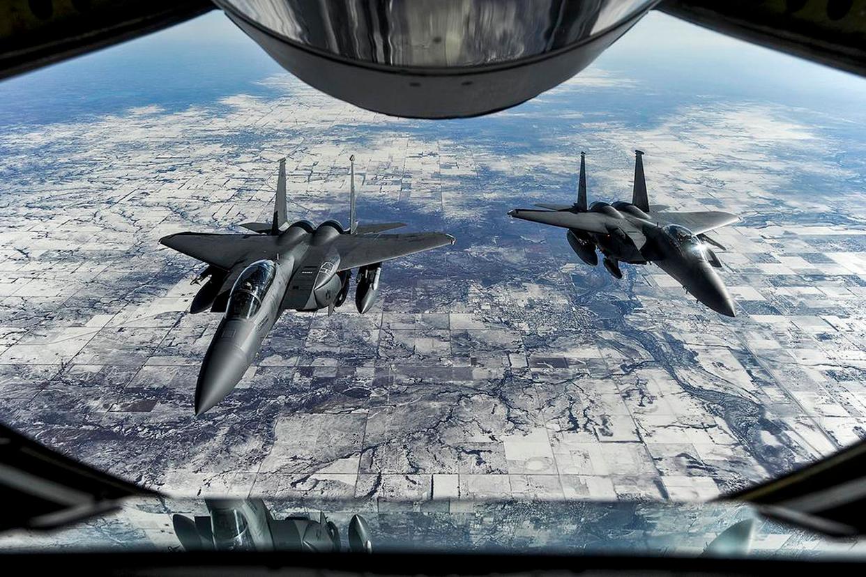 两架F-15E战斗机准备与一架KC-135R空中加油机对接,进行空中加油。(新华社/路透)