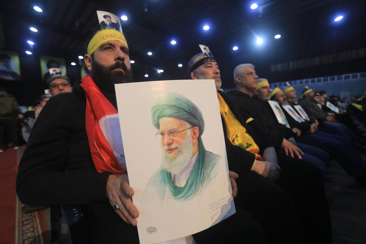 1月26日,在黎巴嫩首都贝鲁特,真主党支持者在集会中举着伊朗最高领袖哈梅内伊的画像,表达对伊朗的支持,并谴责美国的威胁。新华社发(比拉尔·贾维希摄)