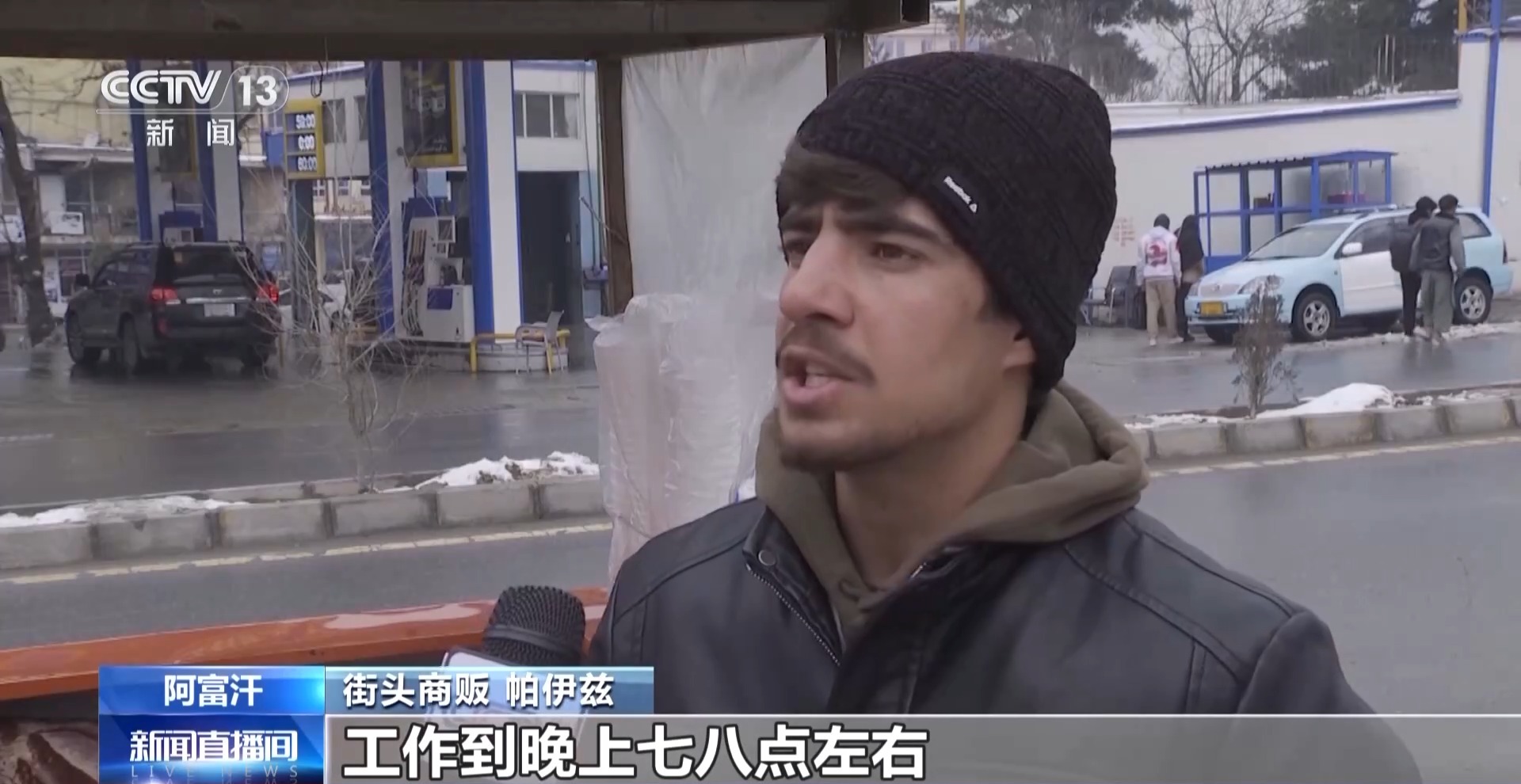 街头商贩 帕伊兹:现在外面很冷,脚下是冰,很凉,空气也很冷。我每天早上九点出摊,工作到晚上七八点左右。我必须每天都出摊,如果休息,不干活,全家九口人就没饭吃。无论天气多冷,我都要为家人挣口饭吃,家里没有其他人能赚钱。