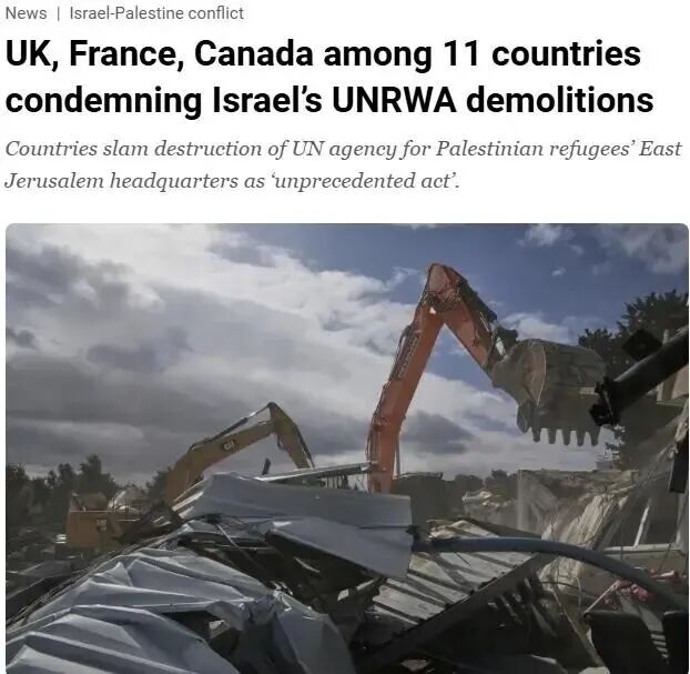 据参考消息援引埃菲社报道,比利时、丹麦、法国、冰岛、爱尔兰、挪威、葡萄牙、西班牙、英国、加拿大、日本等11国的外长或外交大臣,于28日发表联合声明:“我们强烈谴责以色列当局1月20日拆毁联合国近东巴勒斯坦难民救济和工程处(近东救济工程处)位于东耶路撒冷的总部的行为。”