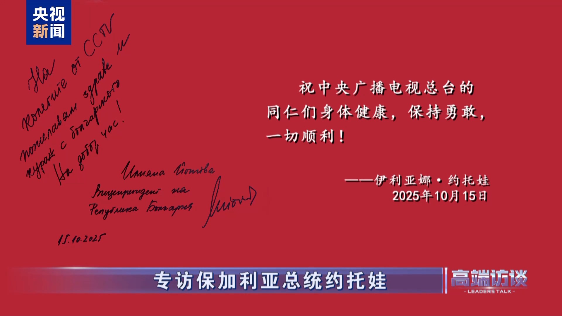 △保加利亚总统约托娃在接受总台专访后题词