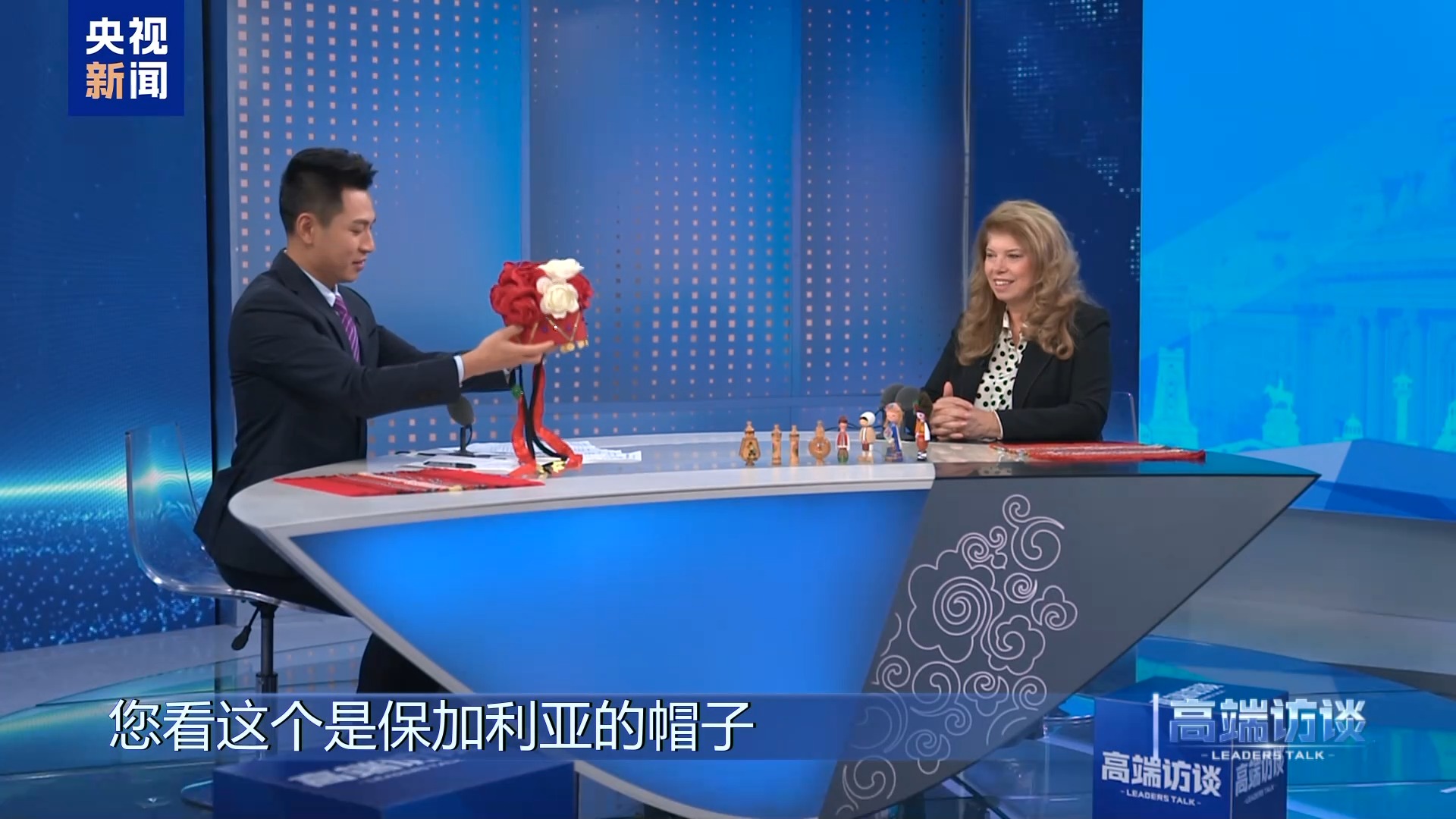 何岩柯:我们今天准备了很多有关保加利亚的东西。您看这个是保加利亚的帽子,还有两个小辫子,它平常是干什么用的?