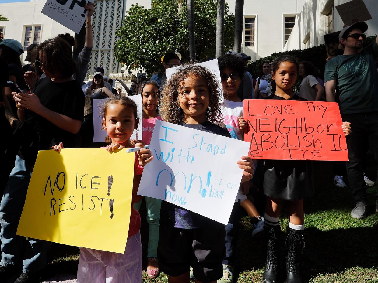 1月30日,人们在美国加利福尼亚州伯班克市政厅前参加抗议示威。新华社发 亚利桑那州图森市至少20所学校30日也因预期罢课而取消课程。加利福尼亚州长滩市和纽约市布鲁克林区的高中生手持反对ICE的标语举行罢课游行。芝加哥德保罗大学的标语牌上写着“不欢迎法西斯分子”。