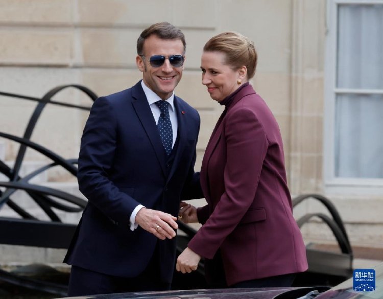 1月28日,法国总统马克龙(左)在巴黎欢迎到访的丹麦首相弗雷泽里克森。新华社发